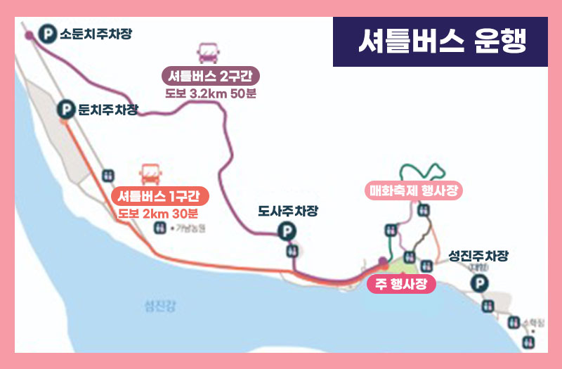 매화축제 행사장 (첫 출발 7:10) ↔ 소둔치주차장 (마지막 출발 16:30)