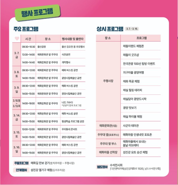□ 체험 프로그램: 매돌이랜드 체험존, 매실 힐링 테라피, 매실 하이볼 체험, 섬진강 요트 승선 체험 등